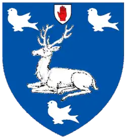 (1948) On either side a hind proper the dexter gorged with a collar Gules charged with a Red rose also proper the sinister gorged with a like collar charged with four pallets Argent surmounted by a palm leaf Or.[14]