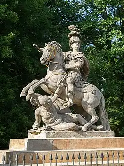 John III Sobieski Monument (Polish: Pomnik Jana III Sobieskiego) is a sculpture in Warsaw, Poland, within the neighbourhood of Ujazdów in the Downtown district, in the Royal Baths Park. It is a sandstone equestrian statue of John III Sobieski, monarch of the Polish–Lithuanian Commonwealth from 1674 to 1696, commemorating his victory in the battle of Vienna in 1683, against the Ottoman Empire. It was designed by André-Jean Lebrun and sculptured by Franciszek Pinck, and unveiled on 14 September 1788. It is placed on the Sobieski Bridge at Agrykola Street.