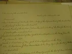 As a result of the Old Court – New Court controversy, Kentucky's politicians became divided between the Democrats and the National Republicans.[34] Crittenden's alliance with Henry Clay and his own personal political views put him squarely in the National Republican Party.[30] Because of Crittenden's support of his presidential bid, President Adams appointed him United States district attorney for the district of Kentucky in 1827.[9] In 1828, Adams nominated him to replace Kentuckian Robert Trimble as an associate justice of the Supreme Court, but Jackson supporters in the Senate refused to confirm him.[5][30] When Jackson defeated Adams in the 1828 presidential election, he removed Crittenden from his post as district attorney because of his association with Clay and his opposition to Jackson's financial policies.[25]