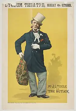 In 1854,[9] Toole made his first professional appearance in London at the St. James's Theatre, acting as Samuel Pepys in The King's Rival, by Tom Taylor and Charles Reade, and Weazel in My Friend the Major by Charles Selby.[3][5] There he also played in Boots at the Swan and Honours before Titles.[10] He returned to the provinces, but by 1856 was engaged in London at the Lyceum Theatre, including as Hilarion Fanfaronade in Belphegor, in which Marie Wilton made her first London appearance.[11] Thereafter, he frequently performed with Wilton.[5] In 1857, having had a great success in London as Paul Pry in John Poole's farce of that name, he made his first of many successful provincial summer tours and often repeated the character thereafter. During this first tour, he met and acted together with Henry Irving, and the two remained close friends over their long careers.[3] In 1858, he scored a notable hit creating the role of Tom Cranky in John Hollingshead's farce The Birthplace of Podgers.[1]