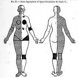 Around 1885, an associate of Charcot, Albert Pitres, another famous French neurologist at the Salpêtrière hospital, in a throwback to phreno-mesmerism, went even further, claiming that he had discovered zones hypnogènes, or "hypnogenetic zones" which, he said, when stimulated threw people into the hypnotic state, and zones hypnofrénatrices or "hypno-arresting zones", which, when stimulated, abruptly threw people out of that same hypnotic state (Pitres, 1891, passim).