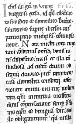 The opening of John's Descriptio from the Tegernsee manuscript. It begins Johannes, Dei gratia in wirziburgensi ecclesia, id quod est, dilecto suo socio et domestico Dietrico salutem et supernae Jerusalem... ("John, who by the grace of God is that which he is in the church of Würzburg, wishes health and a sight of the heavenly Jerusalem to his beloved friend and follower Dietrich...")[1]