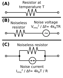 A resistor with thermal noise can be represented by its Thévenin equivalent circuit (Figure 4B) consisting of a noiseless resistor in series with a gaussian noise voltage source with the above RMS voltage.