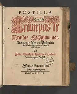 After living twenty-five meager years in Labiau, Bretke (Jonas Bretkūnas) applied for a position as pastor at another Prussian town, but was in 1587 transferred to a Lithuanian language parish in Königsberg as pastor.[2] He continued with his translation of the Bible and other scholarly works. In 1589, he published several new works, in particular "Giesmes duchaunos" (Spiritual Hymns), based on Martynas Mažvydas' works, as well as a small collection of hymns called "Kancionalas netukriu giesmiu", and a prayer book translation from German into Lithuanian "Kollectas", all printed by Georg Osterberg of Königsberg.