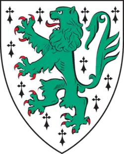 The official insignia of JE is its shield, described in heraldic terms as ermine, a lion rampant vert. Designed by Fritz Kredel, it is a simplified version of the coat of arms believed to have been used by the Edwards family.[40] A green, rearing heraldic lion symbolizes courage and purity of heart. Its crimson tongue and nails exhibit willingness to pursue its goals with passion both of speech and strength. The veil of white that surrounds the lion symbolizes the grace of God. This shield is used on formal decorations and college letterhead.