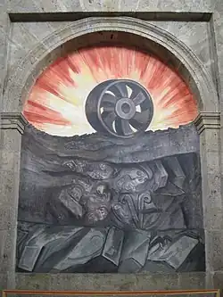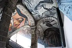 On the first floor of the Escuela Nacional Preparatoria are a series of murals, including The Trench, The Destruction of the Old Order, Maternity, The Strike, The Trinity, and The Banquet of the Rich. The first image is "located under the central arch of the ground floor of the north wall and is the only wall section perfectly framed by the colonnade from the vantage point of the center of the courtyard" and is called The Trench. A unique aspect of the first floor murals is that each mural parallels in width to the arched openings of the colonnade. The Destruction of the Old Order and Maternity are located to the right of The Trench. To the left of The Trench are The Strike, The Trinity, and at the intersection of the west corridor is The Banquet of the Rich.[16] Among the murals that Orozco destroyed are The Elements, Man Struggling Against Nature, Man Falling, and Christ Destroying His Cross.[16] An interesting element of the destroyed mural Christ Destroying His Cross, of which Orozco only kept Christ's head, is that he reverted to the use of Christian iconography: Christ is destroying his cross in agony over its misuse as a symbol.[17]