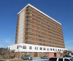 The apartments cost $1,626,000 when it was built, starting in 1950.[1] The ground floor was supposed to have space for commercial spaces, and the second floor was to have professional offices such as lawyers or doctors along with 156 apartments. Rent for an apartment ranged from $75 per month for a one-bedroom efficiency to $175 a month for one of three three-bedroom penthouse apartments. The property had been bought by Mr. Leonard D. Long in 1933 when it housed a tent community and there were only two nearby houses. Immediately before the construction began in January 1950, the site was home to a World War II-era nightclub known as the Windmill which was being used as a grocery store. The apartments were meant to cater to single men and women and retirees.[2]
