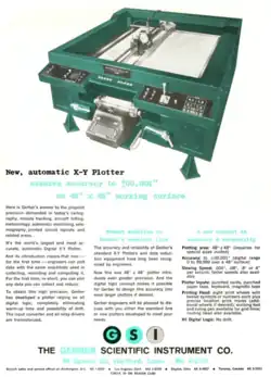 [6] Receiving a $3,000 investment, Gerber patented his Variable Scale and founded the Gerber Scientific Instrument Company in Hartford, Connecticut, to produce and market the device. Before the widespread use of digital computers, performing computations based on graphically recorded data and curves was extremely time-consuming and complex. The Gerber Variable Scale—which used a triangular calibrated spring as a computing element to eliminate all scaling and conversions between numerics and graphics—provided means for quick, efficient calculations,[7] and became known as "the greatest engineering tool since the slide rule".[8]