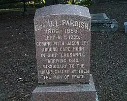 Josiah was married in 1833 in New York to Elizabeth Winn (died 1869), and they had four children,[1] one of whom was Samuel B. Parrish.[3] In 1839, the trained blacksmith volunteered to join Jason Lee's mission in the Willamette Valley.[1] Parrish and around 50 others sailed on the ship Lausanne around Cape Horn in South America to the Columbia River and on to Oregon City in what has been called the Great Reinforcement of the Methodist Mission.[1] They set sail on October 9, 1839, from New York City.[2]