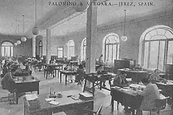 In the mid-1940s Palomino attempted a dynamic expansion on the Spanish market. As he lacked funds, he intended to transform the company from family business to a joint-stock public limited company, the first of this kind among the Jerez wine enterprises.[94] In 1947 he set up a Madrid-based Palomino SA, which controlled Palomino & Vergara.[95] He was also opening branches across the country, with regional offices in Madrid, Barcelona, Valencia, Bilbao, Oviedo, Palma, Santander, Logroño, Burgos and Zaragoza.[96] At that time P&V offered a wide range of products, principally brandy (Tres Racimos,[97] Vencedor, Centurion,[98] Eminencia) and various types of sherry: cortado (Bulería), fino (Tío Mateo),[99] oloroso (Los Flamencos)[100] and amontillado (John Peter).[101] The company produced also anisette (La Jerezana)[102] ponche (Carlista)[103] and gin (Palomino).[104] Its large Jerez bodega complex, known as “12 disciples”, was plugged into the railway network by means of own dedicated siding.[105]