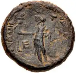 After their murders, all images of Empress Milonia and young Drusilla Minor were destroyed in hopes of making people forget they ever existed, as a sort of damnatio memoriae. Although these once did exist, no sculptures of Milonia and Drusilla survive.[10] Although other, more powerful motives caused the deaths of her parents, Drusilla's murder was only justified by her paternity: as Caligula's only legitimate child, she could have claimed the throne for her descendants or even for herself.[10] The only surviving image of Drusilla is a coin issued by Herod Agrippa the Great, King of Judea, that represents Drusilla as a small child sitting next to Victory. The coin reads "to Drusilla, daughter of Augustus."[11][12]