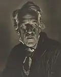 Smith's work served as material for discussion during the 1930s of the artistic worth of photography. Painter Arthur Streeton, reviewing the 1931 International exhibition of the Victorian Salon of Photograph at the Athenaeum Gallery, after a preamble supporting the idea that photography is art, chooses for his first comments Smith's The Painter, La Rixe ('The Brawl')[57] and Flight.[58] Of the same show watercolourist Blamire Young remarks on Smith's determination "to extract from his models the very utmost they can offer in the way of character and presentment. His lighting effects are still further systematised, and his control of his medium appears to be on the verge of the absolute," hailing his portrait of John Shirlow "as good as anything Dr. Smith has done. It shows the fine feeling for type which guides him in the selection of his sitters, and which so frequently places his work in the front rank," though, at odds with Streeton he condemns the "crudity of ... design" in La Rixe which "reminds of the gulf which still separates photography from fine art."[59]