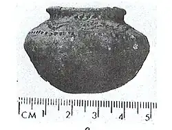 1,031 rim and decorated body sherds were recovered, representing at least 309 vessels. This pottery is characterized by round bodied vessels without pronounced shoulders; less decoration with cords and cord-wrapped objects; collared and everted rims; punctate and drag-and-jab decoration. Similar to pottery found in Southwest Ontario including early Ontario Iroquois.[4]