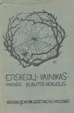 Published in 1906, the drama Potępienie (Condemnation) was a manifestation of the medieval mysticism characteristic of Young Poland.[18] Published in 1911, the book I nie wódź nas na pokuszenie… (And Lead Us Not Into Temptation...) was a symbol of the author's conversion to Christianity.[18] In 1912, he published the work Głos bólu (Voice of pain), in which he summarized the development of the Lithuanian national movement, condemned the nationalist activities of the Polish and Lithuanian clergy, and called for a joint struggle for liberation.[19] His next book, Ironiczna nauka dla umysłowo dojrzałych dzieci (Ironic Lessons for Mentally Mature Children, 1914), was a presentation of the author's concept of literature, as well as a critique of contemporary Polish literature – particularly the work of Tadeusz Miciński, with whom Herbačiauskas was in long-standing conflict, but also of Stanisław Wyspiański, Stefan Żeromski, and Stanisław Brzozowski.[20]