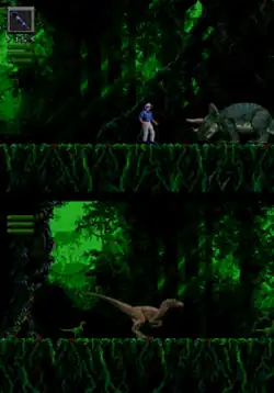 Jurassic Park is a standard side-scrolling action video game, with platform gameplay elements.[4] The end objective is to reach the end of each level, using items placed at fixed locations. However, the game features a then-uncommon variation in action games, giving players the option of using two characters that played independently to one another. The game is playable as either paleontologist Dr. Alan Grant, or a Velociraptor.[4] Grant is the default character and can be switched to the Raptor using the "Player" option on the game's main menu. The game has three selectable difficulty levels: "Medium" is the default neutral setting while "Hard" means more damage taken from enemies (who move faster and attack frequently) and "Easy" mode makes for less troublesome foes from which relatively little damage is taken.