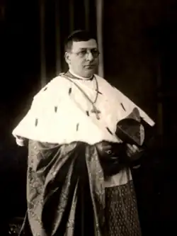 He served in Hungary's Upper Chamber of Parliament and voted in favour of antisemitic legislation first passed in 1938.[1] In 1938 Serédi hosted an Ecumenical Congress along with the future Pius XII.[2] In 1939, after the September Invasion of Poland by Germany, at least 150,000 Polish refugees, both civilians and military, found sanctuary in Hungary, and the refugees included thousands of Polish Jews. Responding to the crisis, cardinal Serédi helped organize service for the refugees, ordering Hungarian Church officials to get actively involved in the religious and charitable services in the Polish refugee camps, among others he was instrumental in organizing a school and foster home for the Jewish children, eventually saved through the efforts of Henryk Sławik and his Polish and Hungarian associates. He is said to have quoted 1 John 4:18 "timor non est in caritate sed perfecta caritas foras mittit timorem quoniam timor poenam habet qui autem timet non est perfectus in caritate," when referring to his Polish and Jewish wards. In the spring of 1944 he issued a statement condemning the attacks on, discrimination against and deportation of the Jews on racial grounds.[3] Serédi also worked to try to get Catholic Jews exempted from deportation and death, but was only able to get the rule to apply to those who were priests, monks or nuns.[4] In April 1944 Serédi protested the treatment of Jews by the Nazis in Hungary.[5] On the other hand, he did not make any public condemnation available to Catholics inside Hungary against the deportation of the Hungarian Jews to Auschwitz. On June 29, 1944, he decided against issuing a pastoral letter clarifying the view of the church on this issue.