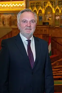 He was a candidate in the general election in April 1994. He was elected incumbent representative to the County Assembly in the local elections in December 1994.[1] In 1998 he was elected MP from the party's Pest County Regional List. He was re-elected as a local representative and deputy mayor in Gyál in October 1998. He was elected deputy head of the Gyál branch of Fidesz the same year. He secured a seat for Ráckeve in the parliamentary election in 2002. After the inauguration of the new Parliament on 15 May he continued to work in the Education and Science Committee. He was elected to the Gyál City Assembly for the fourth time on 20 October. In the parliamentary election held in 2006, he was elected from the Pest county Regional List. He was a member of the Committee on Education and Science from June 25, 1998 to May 5, 2014.[2] He is the President of the National Cohesion Committee since June 23, 2014.[2]