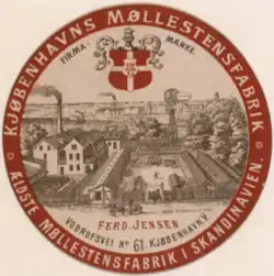 Københavns Møllestensfabrik was founded by Ferdinand Jensen (1844-1898) on 10 November 1868. The company was located on Toldbodvej (now Esplanaden). Jensen had recently returned from Germany and France where he had worked for some of the leading manufacturers of mill stones. The French mill stones were very sought after in Denmark at the time.[1]