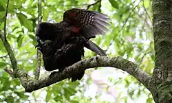 The kākā is a monogamous species that tends to breed in pairs; however, extra-pair copulations, while not common, do occur in kākā.[19] Monogamous pairs often return to breed with each other year after year.[28] Kākā courtship involves the male approaching a female, often on a branch in the canopy. Before mating, the male kākā gently pushes the female with his foot, forehead and beak, then moves away.[28] If the female remains in the same position after this and lowers her head, the male will mount the female and mate.[28] However, if the female leaves after the male's courtship display, mating will likely not occur.[28] Kākā tend to form groups for feeding and mating.[19] In these groups, during the breeding season, males can be protective of their mates and have been observed driving away other species of birds and other kākā from their mates.[19] However, outside of this, kākā are not highly territorial, with nests sometimes being as close as 30m apart during the breeding season.[26]