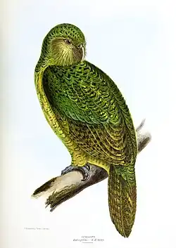 The kākāpō (Māori: [kaːkaːpɔː];[3] pl.: kākāpō; Strigops habroptilus), sometimes known as the owl parrot or owl-faced parrot, is a species of large, nocturnal, ground-dwelling parrot of the superfamily Strigopoidea. It is endemic to New Zealand.[4]