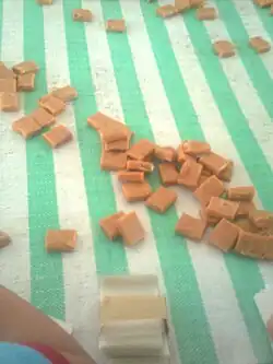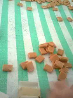 Kẹo dừa is a Vietnamese coconut candy most commonly produced in Bến Tre province, Vietnam, with coconut milk and coconut cream. The Ben Tre Province is nicknamed by the Vietnamese as the "Land of Coconut" (Xu Dua). The Vietnamese term for coconut candy is "kẹo dừa", with kẹo = candy and dừa = coconut. Coconut candy was originally associated with Mo Cay, a township within the Bến Tre province.[1]