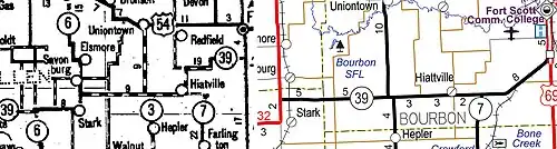 K-39 begins seven miles (11 km) north of Fredonia at U.S. Highway 400 (US-400). It travels east to Benedict, where it turns north toward Buffalo. South of town, K-39 meets US-75 and begins a short, one-mile-long (1.6 km) concurrency with the U.S. Highway. Once leaving US-75, the highway again travels east toward Chanute, where it intersects US-169. The highway continues east 12 miles (19 km) before beginning a seven-mile-long (11 km) concurrency with US-59. After briefly turning north with US-59, K-39 resumes its easterly route north of Stark. The highway shares a very short overlap with K-3 (less than one mile, 1.6 kilometers) and passes through Hiattville before meeting its eastern terminus at K-7, which completes the connection to US-69.[2]