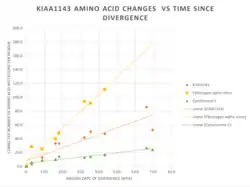 The relative rate of change for KIAA1143 is fairly slow compared to fibrinogen and beta-globin, but not as slow as cytochrome c.