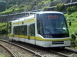 The ultra-low-floor train (U-Tram) began operating on January 15, 2002. Initially, three cars were introduced, with a further three vehicles added between May 2004 and March 2005. There are currently a total of nine vehicles on the line in operation.[2]