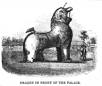 During the months of June and July in the year 1844, Meitei king Raja Nara Singh (Meitei: ꯅꯤꯡꯊꯧ ꯅꯔꯁꯤꯡꯍ) reconstructed the two statues of the Kangla Sha dragons once again.[10][11][12][13][14]