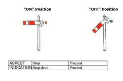 1. The horizontal 'ON' position shows the most restrictive indication (requiring the train to stop or slow down or proceed with caution depending on the kind of signal), and