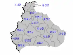 Labeled map of divisions of North Korean Kangwon province (in Korean)