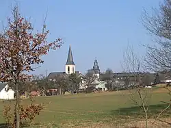 Right near the staggered intersection of Kastellauner Straße and Kirchberger Straße – a spot known as the Dreispitz (“three-point” or “tricorne”) – lies the village centre with the old Evangelical church from 1747 (as it says on the iron brackets on the tower) with mediaeval wall components, the bakehouse (called the Backes, a variant of the usual German word Backhaus) with its upper floor that housed the Catholic school's school room and teacher's dwelling until 1849, and two of the village's biggest homesteads with a guest parlour and guestrooms to let.