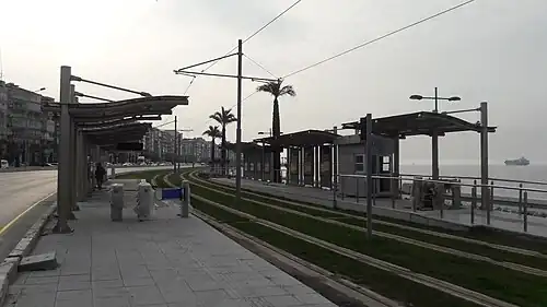 Karataş is a light-rail station on the Konak Tram of the Tram İzmir system in İzmir, Turkey. It is located along the Mustafa Kemal Coastal Boulevard in Karataş, Konak.[1] The station consists of two side platforms serving two tracks.