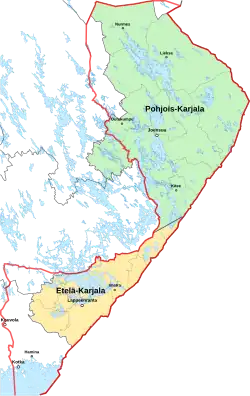 Map of North Karelia (green) and South Karelia (yellow) regions, border of the historical province of Karelia in red