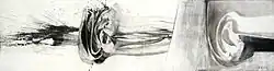As Götz moved away from clearly defined forms, his approach to painting became more dynamic. In a technique Götz has continued to use throughout his later painting career, the image is developed through a lengthy, intense process, often involving a large number of preliminary sketches and gouaches. Once the preparation is complete, the artist applies dark paint onto a light background with a paintbrush, working in a fast and focused way. The paint is then "raked" - partially removed using a type of spatula known as a "rake" - before the contrast between the light and dark areas of the still-moist surface is softened using a dry paintbrush.[18][19]