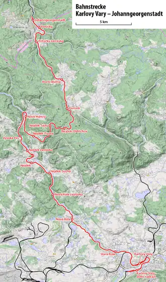 The Karlovy Vary–Johanngeorgenstadt railway connects Karlovy Vary in the Czech Republic with Johanngeorgenstadt in Saxony, Germany. The highest point of this mountain railway lies 915 metres (3,002 ft) above sea level. The entire line was opened for regular traffic in 1899.