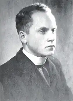 In 1940, following the Soviet Union's occupation of Lithuania, 19-year-old Vasiliauskas soon came face to face with the policies of the new regime. The Soviet authorities outlawed all organizations, including Ateitininkai.[3][4] As a prominent leader within this now-illegal organization, Vasiliauskas discovered that he had been placed on an NKVD arrest list.[5][6] In the spring of 1941, Vasiliauskas and several gymnasium friends attempted to cross the border into East Prussia, Germany. However, after crossing they were detained by the German authorities and transferred to the Soldau concentration camp, where they were held for three months.[1][7][8]
