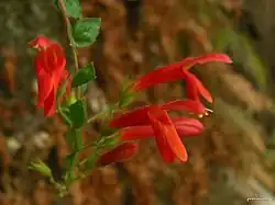 This is a spreading shrub reaching maximum heights in excess of two meters. Its shiny green leaves are oval to heart-shaped, pointed, and edged with small teeth. They are 2 to 6 centimeters long and arranged oppositely on the branches. The shrub produces glandular, hairy inflorescences of many flowers each. The flower is somewhat tubular with a wide open mouth. It is fuzzy on the external surface and any shade of pale orange to deep scarlet. It is up to 3 centimeters long and 4 wide at the mouth, which has three flat lower lobes and two joined upper lobes. Inside the mouth are long filamentous stamens and a flat, hairy, yellow sterile stamen called a staminode.