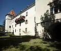 The castle has a square-shaped plan, courtyard and corner towers, two larger and two smaller. Several windows have frames in Renaissance style. Built above the entrance is a picturesque stone balcony on consoles. The consoles can be seen at the floors of the towers. The entrance is on the north side, on a bridge over the outside ditch of the castle. Old documents show that the former citadel (13th century) was protected by moats, walls and towers positioned below the plateau on which the castle was built. These were destroyed during post-war reconstruction work.