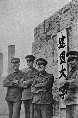 In May 1938, Kenkoku University was founded by an edict of General Kanji Ishiwara in capital Hsinking as the Supreme School of Manchuria (大滿洲帝國最高學府),[13][14] and was run by Professor Sakata Shoichi from Kyoto University.[15] Its purpose was to promote "ethnic harmony" in the region, legitimising and promoting the Japanese occupation.[16] To this end, students were recruited from Japan, China proper, Mongolia, Taiwan, Manchuria, Korea and Soviet Union.[17] As well as offering free tuition, the University also provided its students with board and lodgings, and a stipend.[18] They were gathered at Kenkoku University under the idea of "Five Races Under One Union" to nurture future leaders in Manchuria. Emphasis was placed on "five races equality" (Japanese: 五族平等) and "academic freedom" (Japanese: 学問の自由), and the students slept and ate together in the dormitory, creating bonds that transcend ethnic groups.[19] However, contrary to the original intention of the Japanese authorities, it turned out that Kenkoku was the incubator for a generation of capable Asian leaders who contributed significantly to shaping East Asian identity after World War II. Multiple students of Kenkoku University later became prominent political figures in South Korea—including later South Korean prime minister Kang Young-hoon—, North Korea and China.[20] A number of influential aikido practitioners trained and taught at the University, including aikido's founder Morihei Ueshiba,[21] Kenji Tomiki, Shigenobu Okumura and Noriaki Inoue.[22] In general, students from Japan, China, Korea, the Soviet Union and Mongolia learned at Kenkoku University under the banner of "the harmony of five ethnicities", and sometimes-surprising friendships were forged at the Japan-run institution, even as imperial Japanese troops brutalised much of the region.