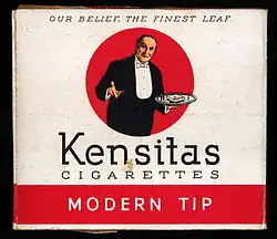 Early packaging and advertising literature featured the Kensitas butler, Jenkyn, always portrayed presenting the cigarettes on a tray. Jenkyn continued to be used by Kensitas in their advertising until the late 1950s.[4] Kensitas claimed that their cigarettes "were made by the Kensitas private process which includes the use of Ultra Violet Rays". Brand slogans included "Kensitas - that's good!", "Our Belief, the Finest Leaf" and "As good as really good cigarettes can be".[5][6]