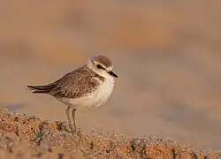 The Kentish plover (Anarhynchus alexandrinus) is a small wader (40–44 g (1.4–1.6 oz)) of the family Charadriidae that breeds on the shores of saline lakes, lagoons, and coasts, populating sand dunes, marshes, semi-arid desert, and tundra.[2][3] Both male and female birds have pale plumages with a white underside, grey/brown back, dark legs and a dark bill; however, additionally the male birds also exhibit very dark incomplete breast bands, and dark markings either side of their head, therefore the Kentish plover is regarded as sexually dimorphic.[4]