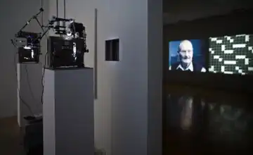 Subsequent projects extended Tribe's cognitive explorations in H. M. to consider communication and empathy.[6][8] The video and sculpture exhibition "The Loste Note" (2015) centered on the communication disorder aphasia, which results from cerebral traumas such as strokes and reflects damage to the brain's language centers.[7][6][5] The show's centerpiece was the three-channel video projection, The Aphasia Poetry Club (2015), which supplanted documentary's typical "talking head" format with loose, associative portraits combining narration by three people with aphasia, photography and animation. Its tri-part imagery conveyed the sense of information overload and difficulty of expression that aphasics experience through scenes with disorienting and obstructed perspectives; the projection was complemented by a series of mixed-media sculptures suggesting typical film production stands and supports bent out of shape and extruded into surreal, non-functional abstract forms.[7][5][6]