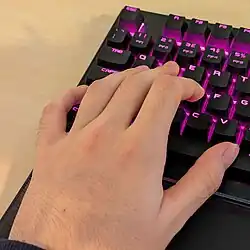 Key rollover is the ability of a computer keyboard to correctly handle several simultaneous keystrokes, often important in gaming as well as for testing rapid key pressing and reaction time. A keyboard with n-key rollover (NKRO) can correctly detect input from each key on the keyboard at the same time, regardless of how many other keys are also being pressed. Keyboards that lack full rollover will register an incorrect keystroke when certain combinations of keys are pressed simultaneously. Rollover has applications for stenotype, electronic music keyboards, gaming, and touch-typing generally.