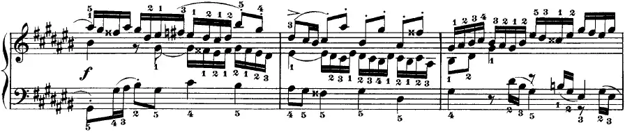 Such passages may instead be notated with the use of double-sharp or double-flat accidentals, as in this example from Johann Sebastian Bach's Well-Tempered Clavier, which has this passage in G-sharp major in measures 10-12.
