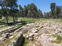 Archeological excavations conducted in Khirbet er-Ra'i in the past decade have uncovered remains dating back to the 12th-10th centuries BCE.[2] According to the site's excavators, it was mainly a Canaanite site, but with a strong Philistine influence.[3]