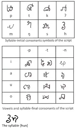 The script was revealed to outsiders by old, dying insiders on two occasions (Sidwell 2008:18). Although the word Khom originally referred to the Khmer, it was later applied to related Austroasiatic peoples such as the Lao Theung, many of which had supported Ong Kammandam.[1]