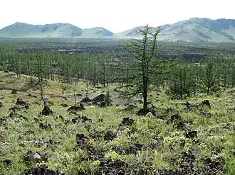 Khorgo Mountain is about 4 km east of the lake, in the Taryatu-Chulutu valley, a volcanic field. Khorgo experienced a significant eruption in approximately 8,000 BCE.
