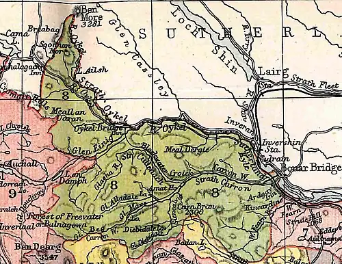 Its northern border is formed by the River Oykel, the Kyle of Sutherland and Dornoch Firth, which divide it from the old county of Sutherland. The Oykel arises in the north-west corner at a height of 1,500 ft. from whence it flows 35 miles to the sea, first southward via Loch Ailsh, then east-south-eastwards until it becomes the estuary of the Kyle of Sutherland.[4] In the east, the parish (or district) is bordered by the civil parish of Edderton, to the south by those of Rosskeen, Alness, Fodderty, and Contin, and to the west by the parish of Lochbroom. All these lie in Ross and Cromarty.