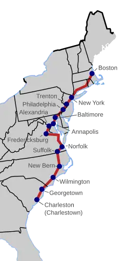 The King's Highway was a roughly 1,300-mile (2,100 km) road laid out from 1650 to 1735 in the American colonies. It was built on the order of Charles II of England, who directed his colonial governors to link Charleston, South Carolina, and Boston, Massachusetts. The section north of New York City, laid out on January 22, 1673, became the Upper Boston Post Road.[1] The road was finally completed in 1735. Much of the Post Road is now U.S. Route 1 and U.S. Route 20.